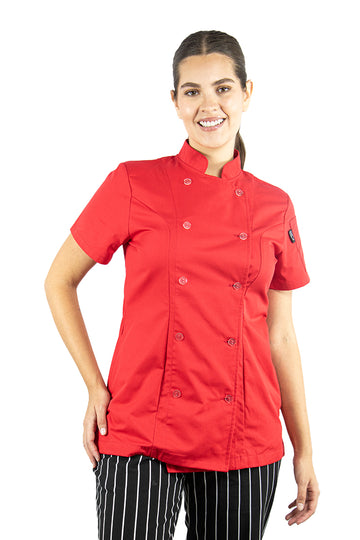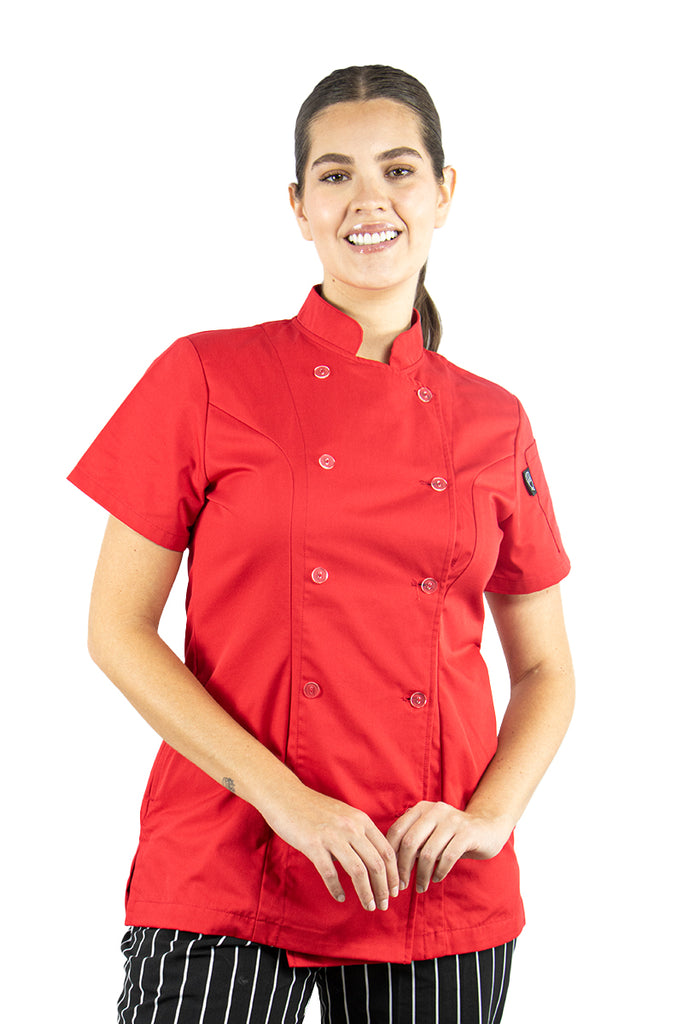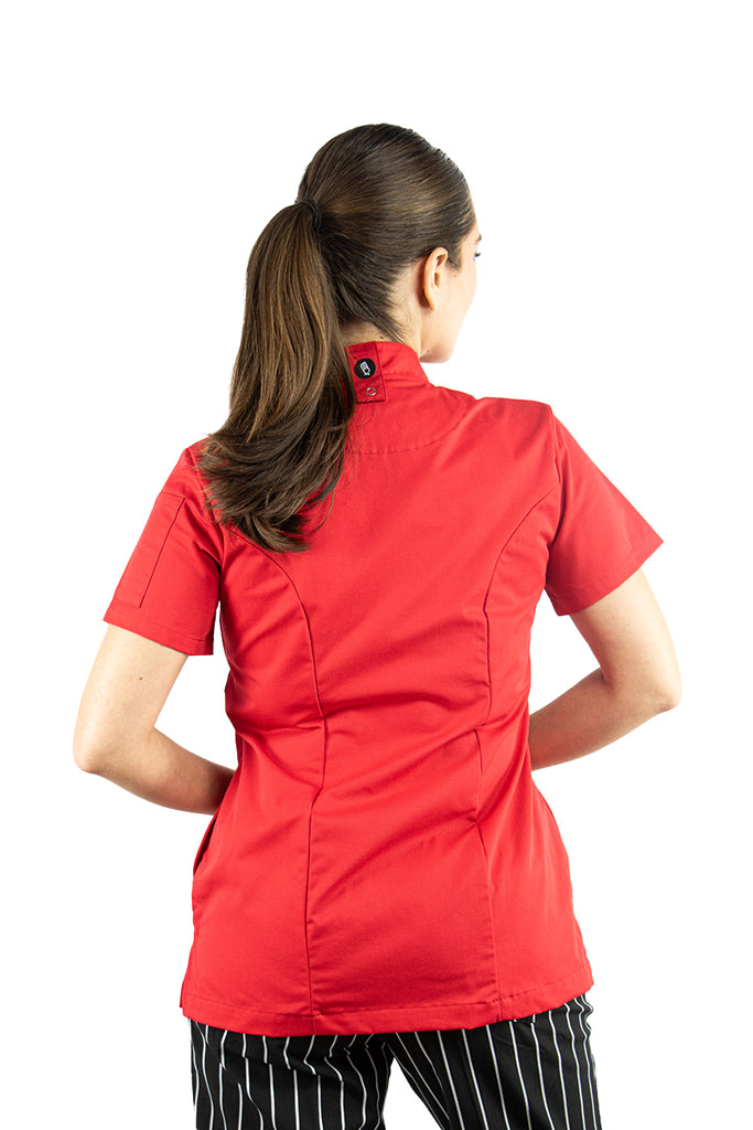 Sus botones transparentes mantienen un estilo limpio y elegante, mientras que el vibrante color rojo aporta energía y personalidad sin perder la formalidad.